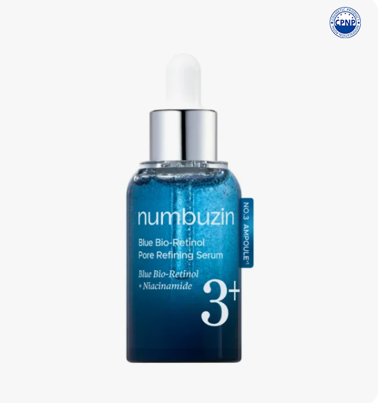 Numbuzin – No. 3 Blue Bio-Retinol Pore Refining Serum – a high-performance serum designed to minimize visible pores, smooth skin texture, and even skin tone. Formulated with a blend of next-generation “Blue Bio-Retinol,” 10% niacinamide, and a touch of BHA, it offers effective anti-aging and pore care while remaining gentle enough for sensitive or retinol-beginner skin.